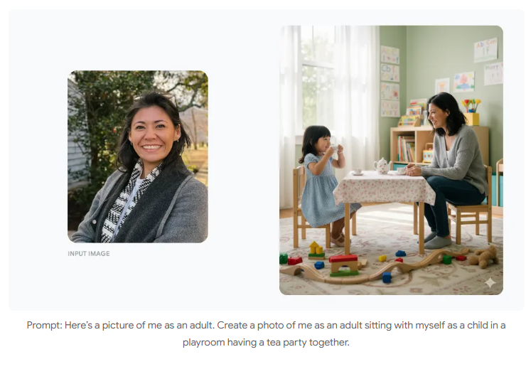 “Here’s a picture of me as an adult. Create a photo of me as an adult sitting with myself as a child in a playroom having a tea party together.”