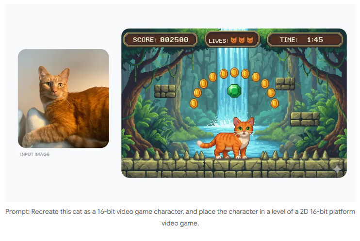 “Recreate this cat as a 16-bit video game character, and place the character in a level of a 2D 16-bit platform video game.”